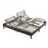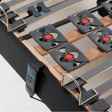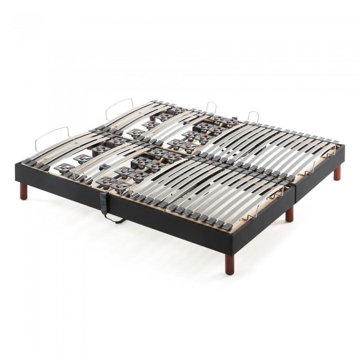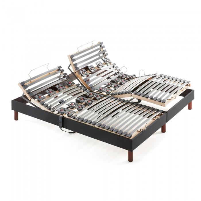 Somier articulado de láminas de madera de haya ergonómicas con motor. Marco de madera tapizado en tela gris oscuro. Patas de madera incluidas.