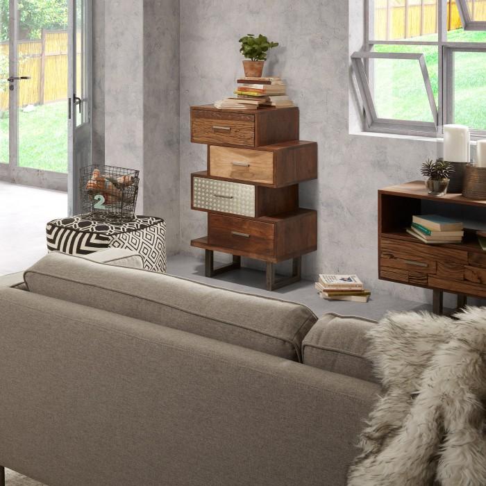 Una cómoda con un diseño especial que dará ese toque especial a la decoración de tu hogar. La combinación de madera de mango en distintos acabados y colores y el original acabado en metal le confiere una personalidad propia capaz de convertirse en la pieza protagonista de ut hogar.