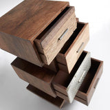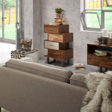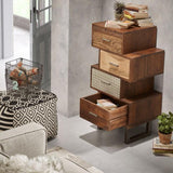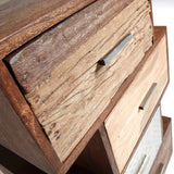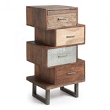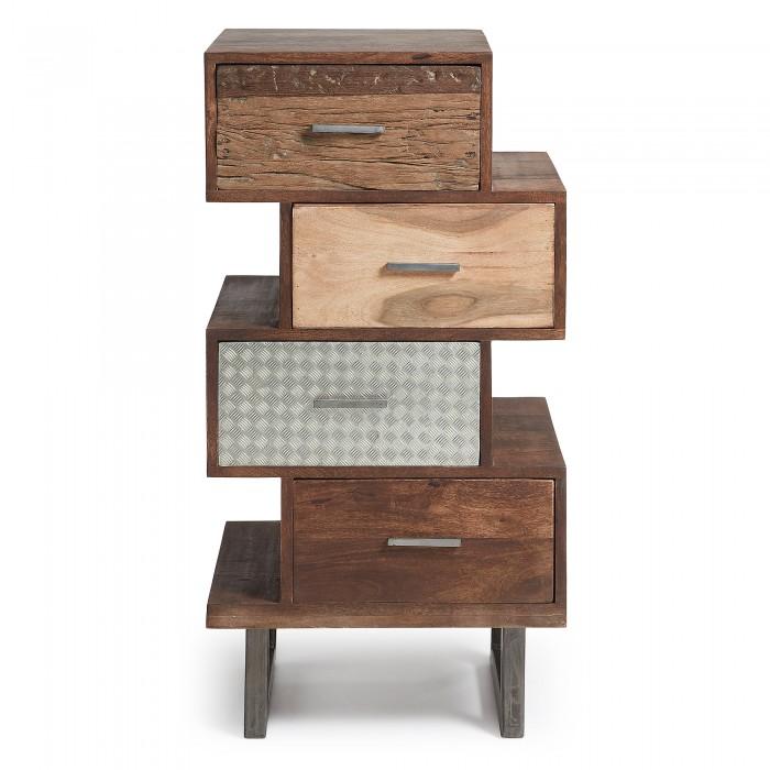 Cajonera con estructura de madera de mango. Frontal con detalles de maderas recuperadas y metal. Pies de metal.