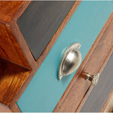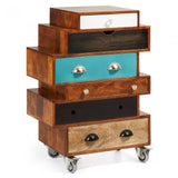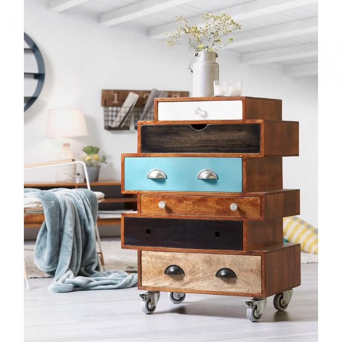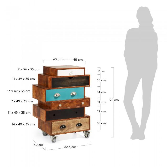 Planteado en clave vertical, este aparador con cajones desafía las líneas rectas y juega con los equilibrios, sin olvidarse de la estabilidad. Sus colores le confieren sofisticación y una cierta elegancia rústica gracias a la madera.