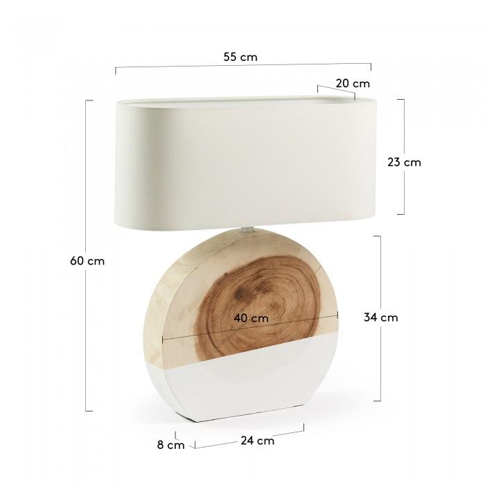 Lámpara de sobremesa en madera tropical natural y blanco. Pantalla de tela. Para bombilla E27 no incluida.
