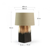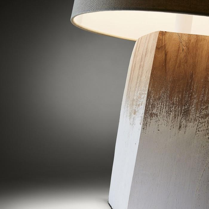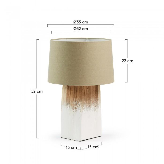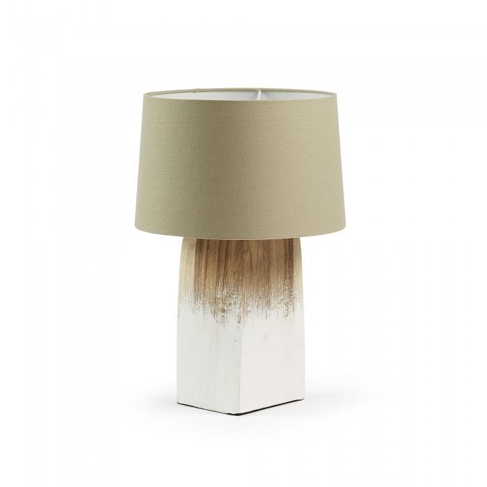 Lámpara de sobremesa en madera tropical natural y blanco. Pantalla de tela. Para bombilla E27 no incluida.