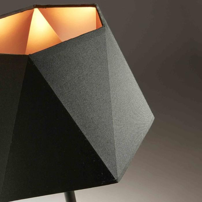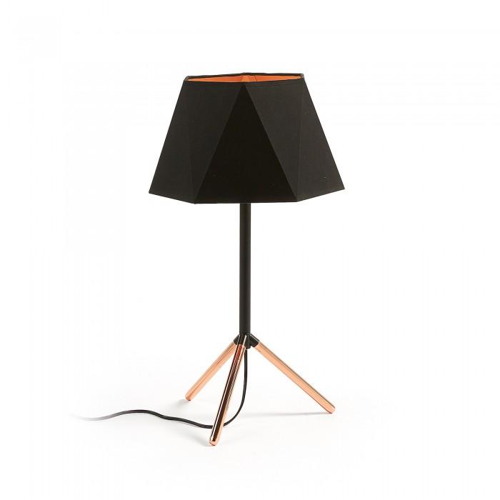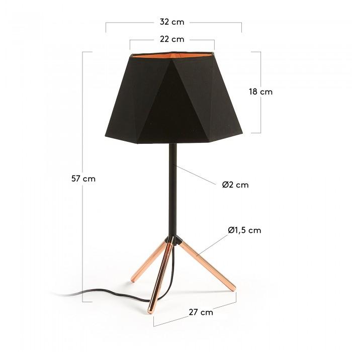 Lámpara de sobremesa con pie de metal. Pantalla en exterior de tela negra e interior cobre. Para bombilla E14 no incluida.