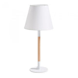 Lámpara de sobremesa con pie en madera y metal. Pantalla de algodón. Para bombilla E14 no incluida.