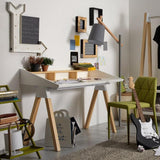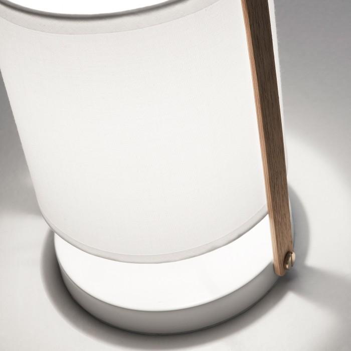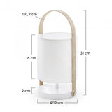 Lámpara de sobremesa con asa de madera. Pantalla de algodón. Para bombilla E14 no incluida.
