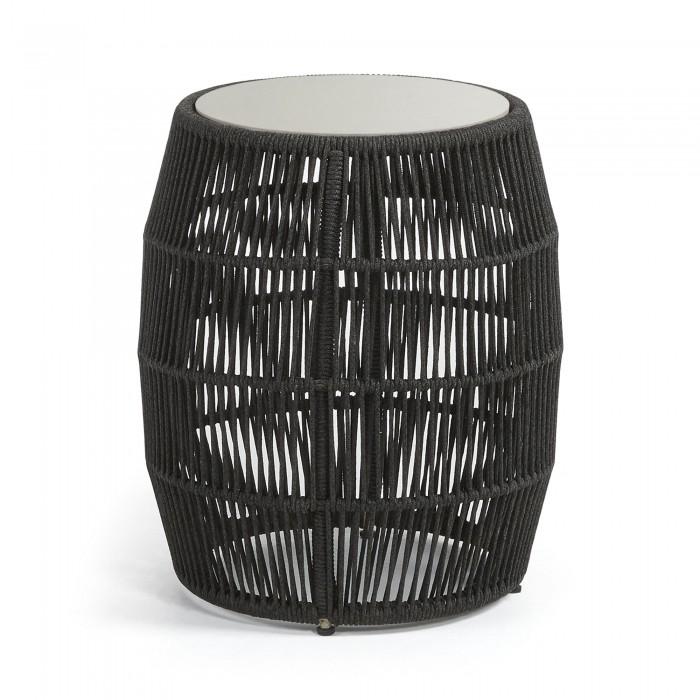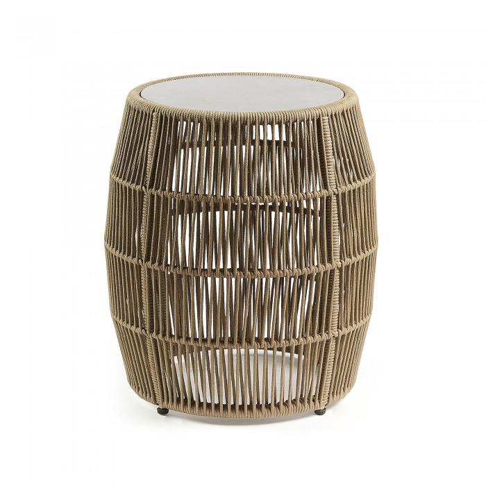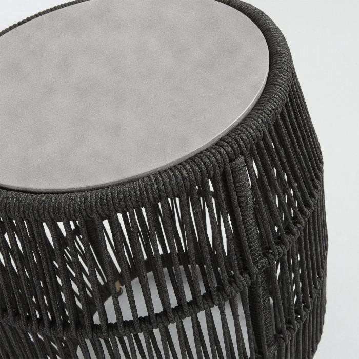 Mesa auxiliar con estructura en acero galvanizado pintado por pulverización recubierta con cuerda de poliester resistente a los rayos UV. Sobre en poly-cemento Superstone. Para uso interior y exterior bajo techo.