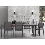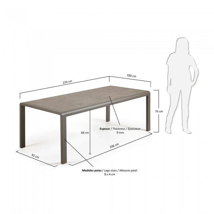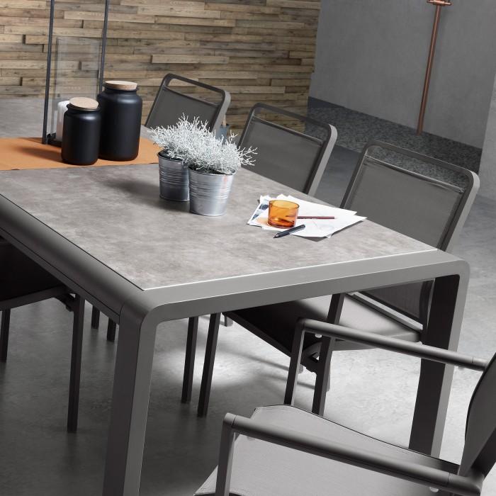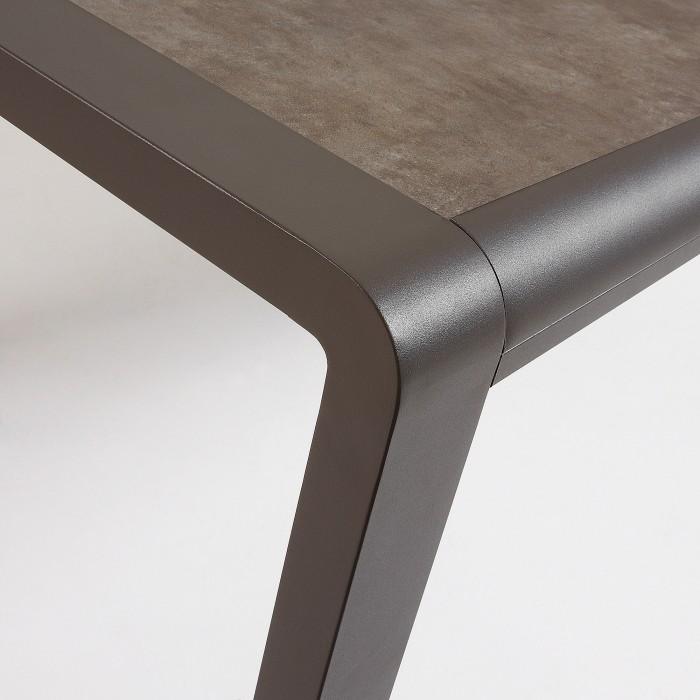 Mesa con estructura en aluminio pintado por pulverización electrostática. Sobre porcelánico técnico con soporte de cristal. Acabado Vulcano Ceniza.