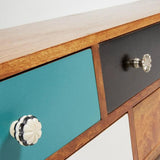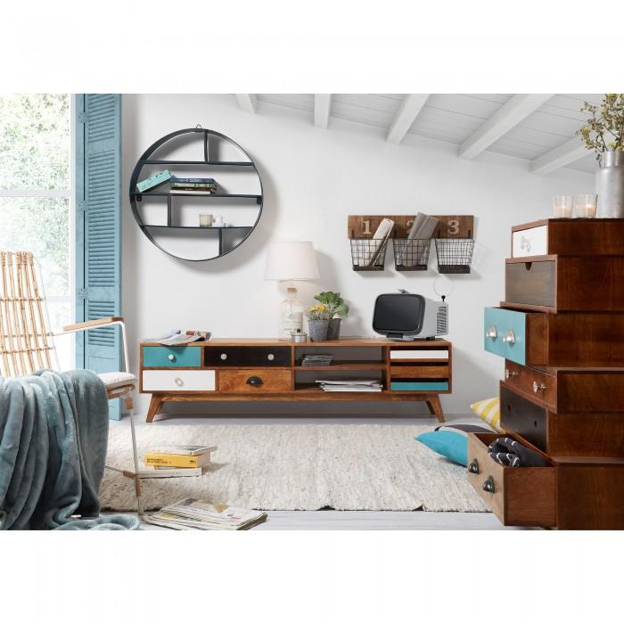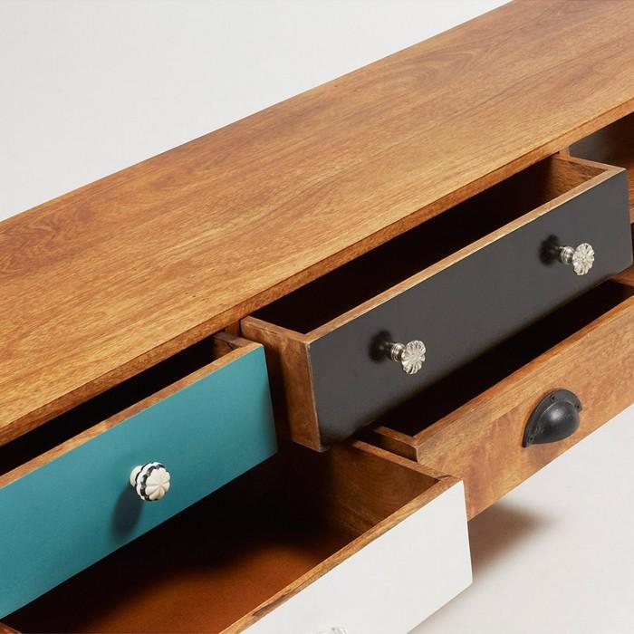 Sus cuatro pies de madera sirven de apoyo para una gran estructura de madera en la que varios cajones multicolor se alternan. Una pieza de mobiliario robusta, elegante y muy funcional.