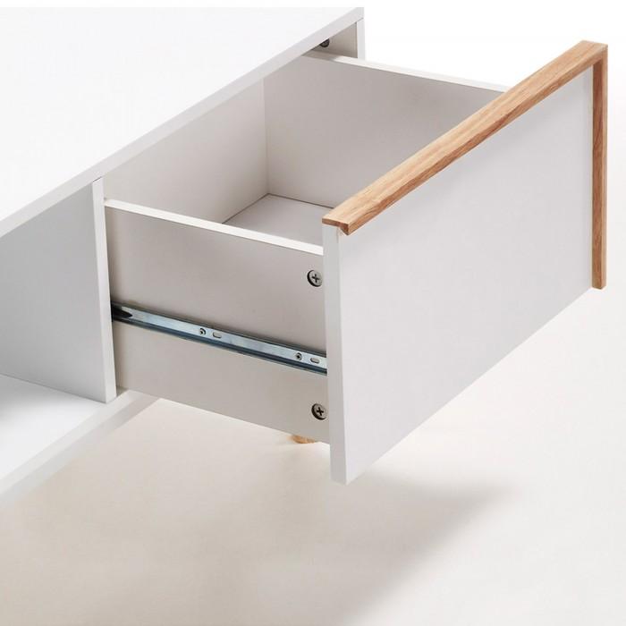Cuatro pies fabricados en madera de roble macizo soportan el peso de una amplia estructura de fibra de madera lacado en acabado mate. En los extremos dispone de dos armarios que te garantizan el espacio necesario.