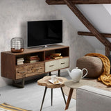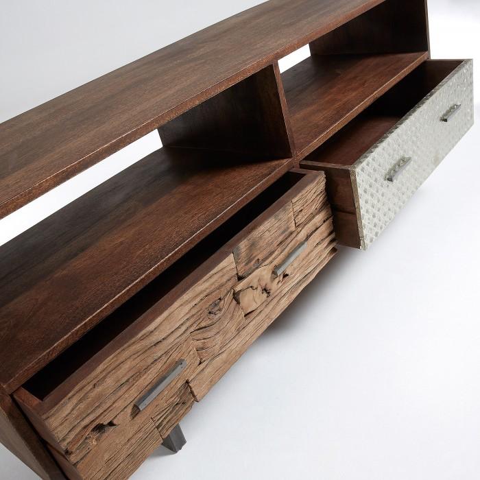 Mueble Tv con estructura de madera de mango. Frontal con detalles de maderas recuperadas y metal. Pies de metal.