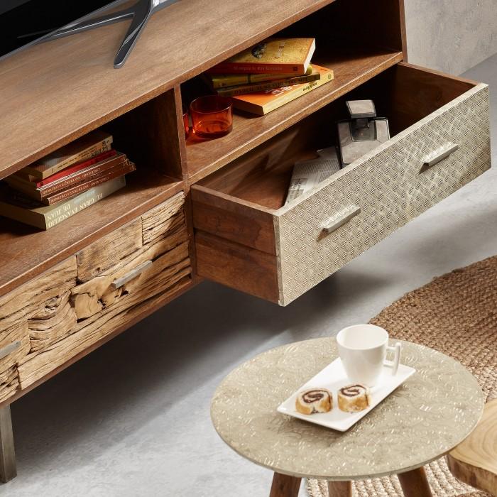 Un mueble TV con un diseño especial que dará ese toque especial a la decoración de tu hogar. La combinación de madera de mango en distintos acabados y colores y el original acabado en metal le confiere una personalidad propia capaz de convertirse en la pieza protagonista de ut hogar.
