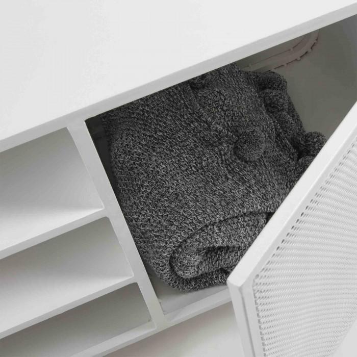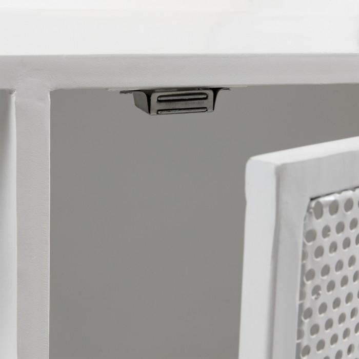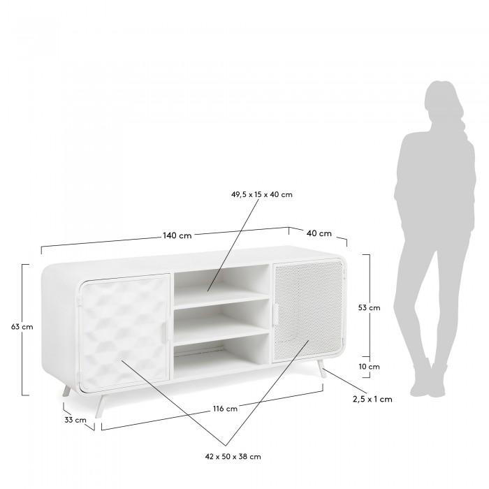 El mueble de TV Rita cuenta en su diseño con la herencia de lo industrial, por su estructura elaborada en metal, con un aire actualizado que hace un guiño a lo moderno. La originalidad de esta pieza reside en sus formas redondeadas, tan comunes en los muebles de madera y tan poco usuales en los metálicos. Y en cuanto a la practicidad, el espacio de almacenamiento que ofrece se suma a la combinación de distintos acabados en sus puertas, una con panel con textura en relieve y la otra perforada.