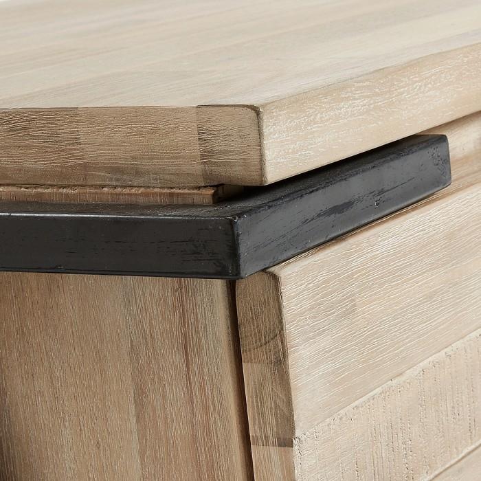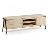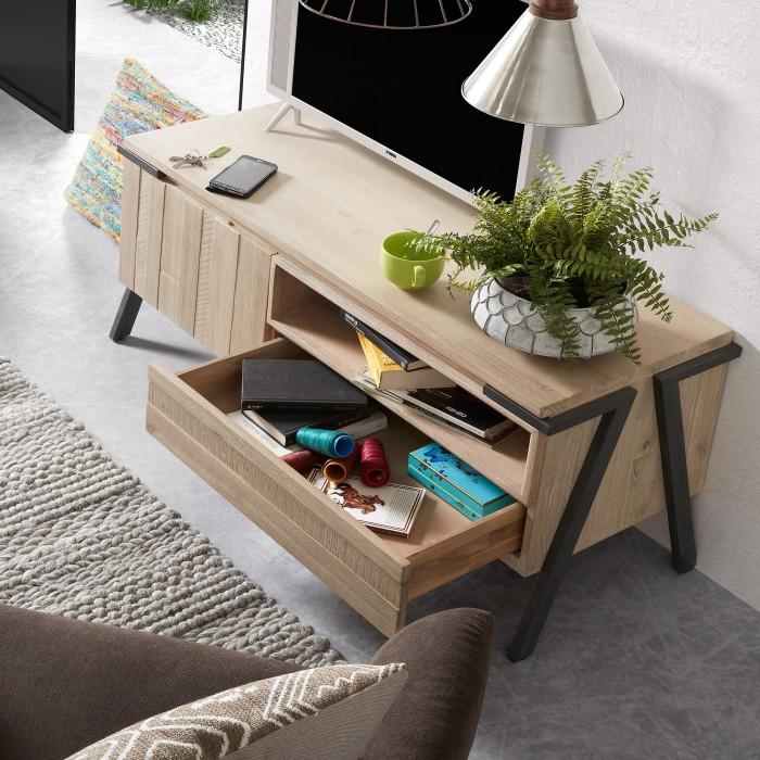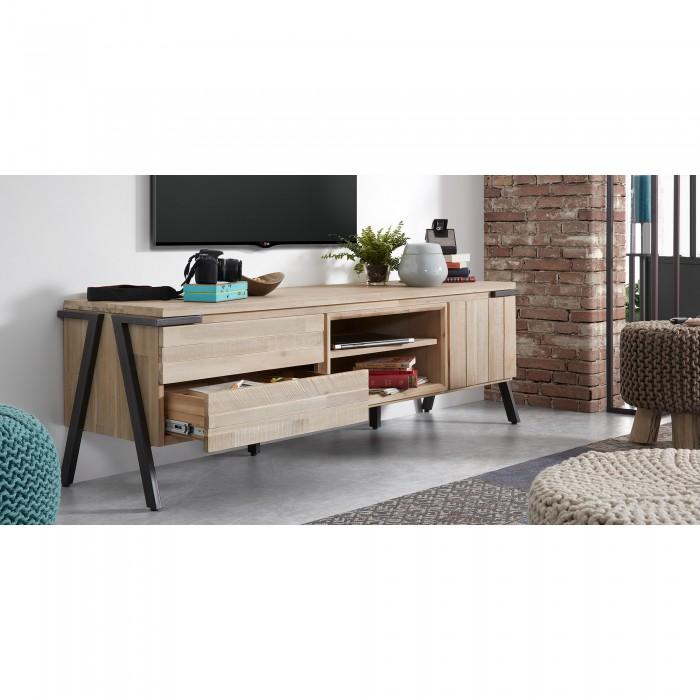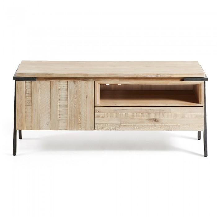 Mueble de televisión en madera de acacia maciza en acabado natural blanqueado. Pies en metal pintado envejecido.