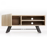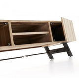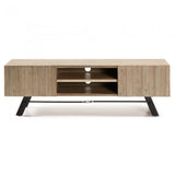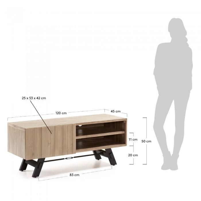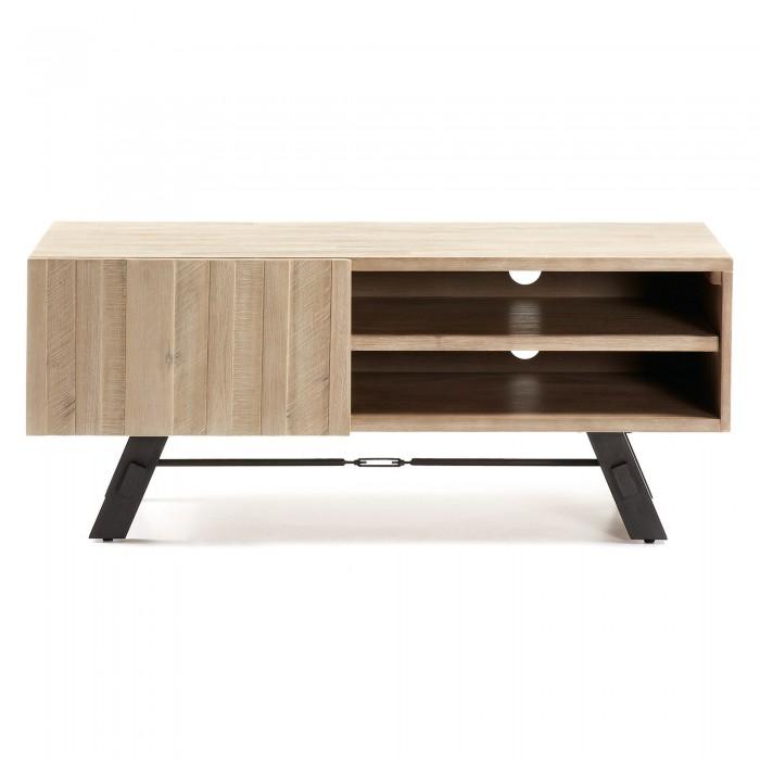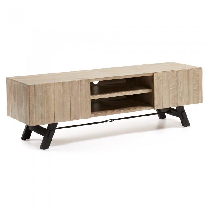 Mueble de televisión en madera de acacia maciza en acabado natural blanqueado. Pies en metal pintado envejecido.