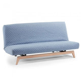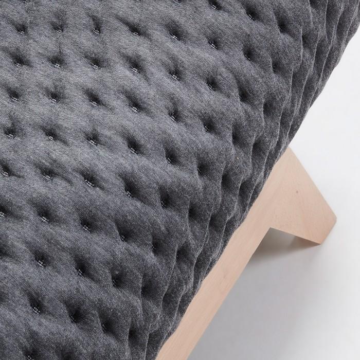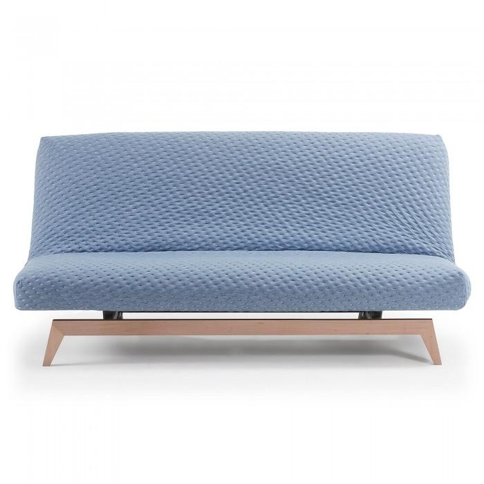 Sofá cama tapizado con tela acolchada. Desenfundable. Mecanismo tipo clic clac, con somier de láminas y futón de poliuretano y algodón. Estructura metálica con pie frontal en madera de haya. Medida cama 130x195 cm.