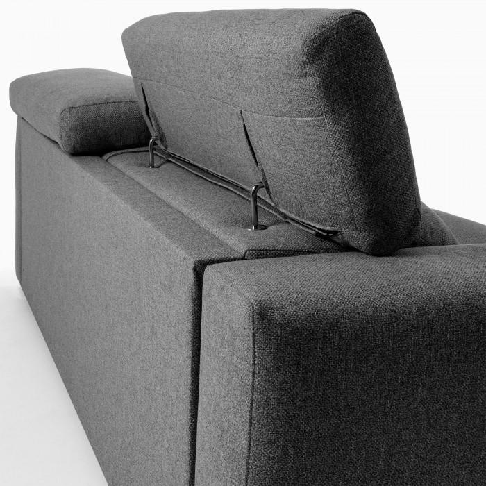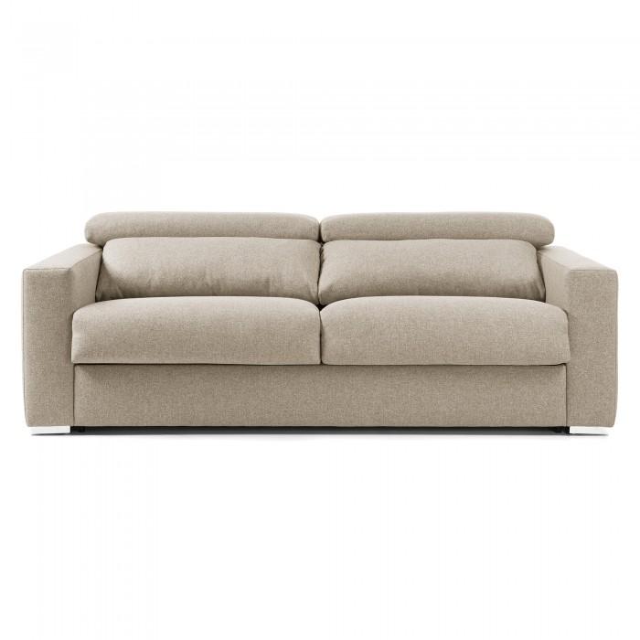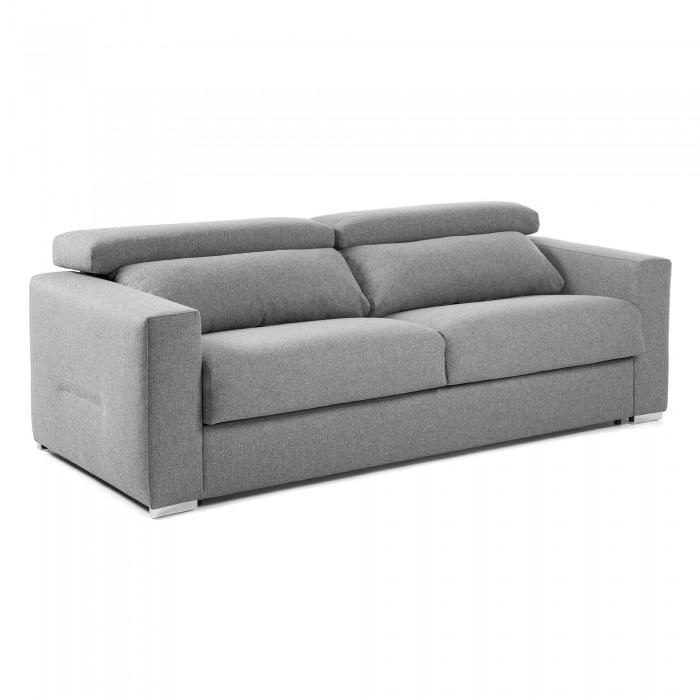 Sofá cama con reposacabezas reclinable. Tapizado con tela Chrono Teflon antimanchas. Mecanismo de apertura sincronizada en 2 pliegues. Colchón en viscoelástico de 160x196 cm, 12 cm altura. Asientos y respaldo desenfundables.