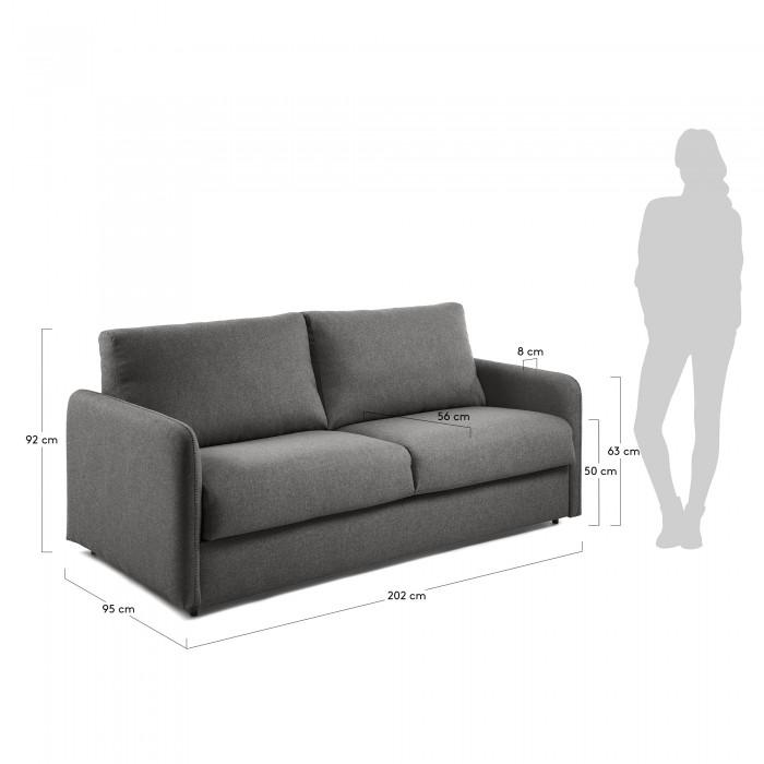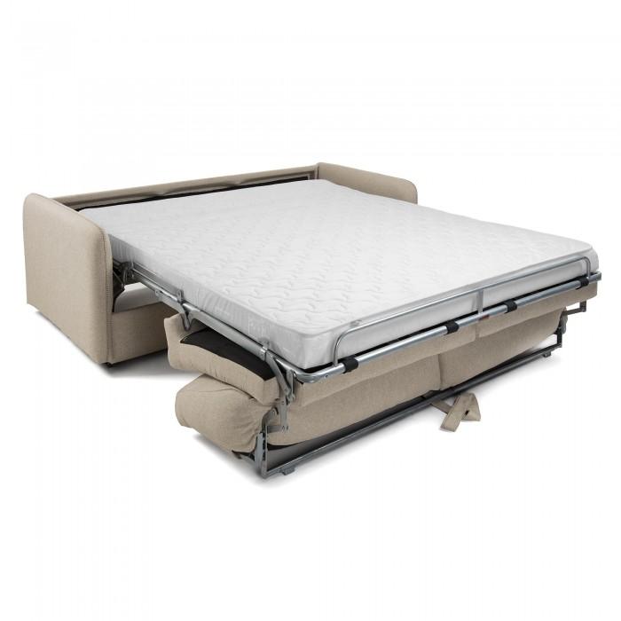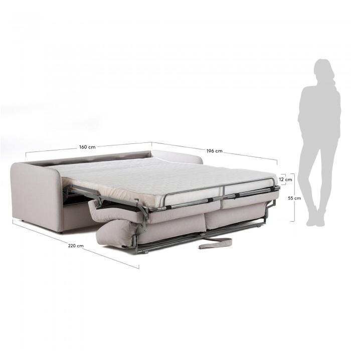 Sofá cama tapizado en tela. Mecanismo de apertura sincronizada en 2 pliegues. Colchón en espuma de poliuretano de 160x196 cm. Asientos y respaldos desenfundables .
